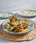 Inspirée des motifs traditionnels siciliens, la collection Albufera se distingue par ses couleurs vibrantes et ses motifs floraux, idéale pour les restaurants chaleureux et conviviaux. Le bord bleu qui entoure l'assiette symbolise la géographie méditerranéenne. Albufera offre une atmosphère chaleureuse aux cuisines professionnelles grâce à sa recette en terre cuite haute résistance.