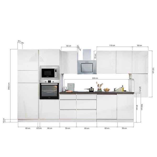 - Cuisine équipée comprenant 1 meuble pour réfrigérateur et four encastrable 60, 1 meuble bas 50, 1 meuble bas pour plaque de cuisson 60, 1 meuble sous évier 100, 1 évier encastrable en acier inoxydable avec évacuation et trop plein, 1 caisson pour lave-vaisselle 60, 1 armoire latérale 50, 1 meuble haut 50, 1 meuble haut 100 & 1 plan de travail
