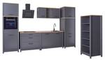 - Contenu de la livraison : Cuisine comprenant 1 meuble sous-évier, 1 meuble bas, 1 meuble pour appareils électroménagers avec rehausse, 1 meuble d’encastrement pour réfrigérateurs avec rehausse, 1 étagère et 1 meuble suspendu