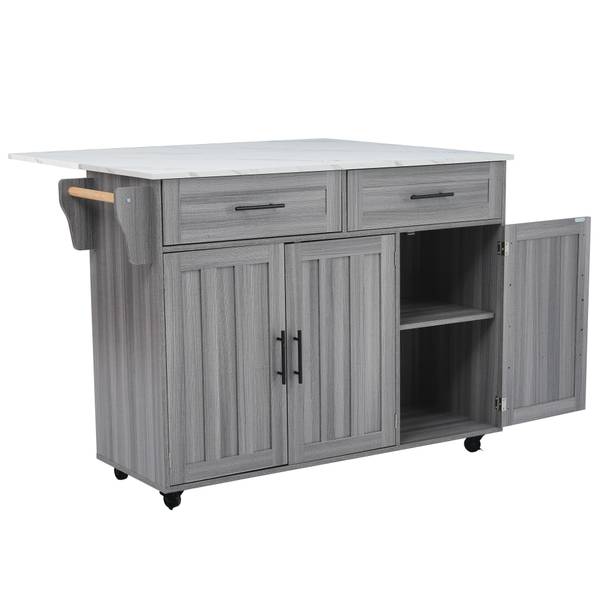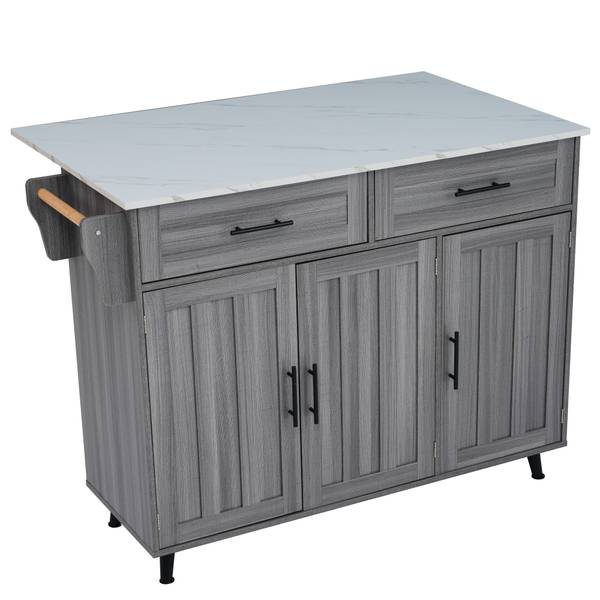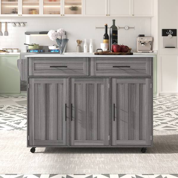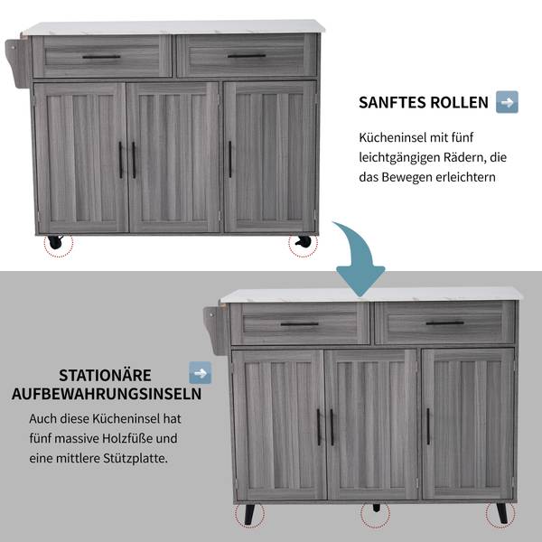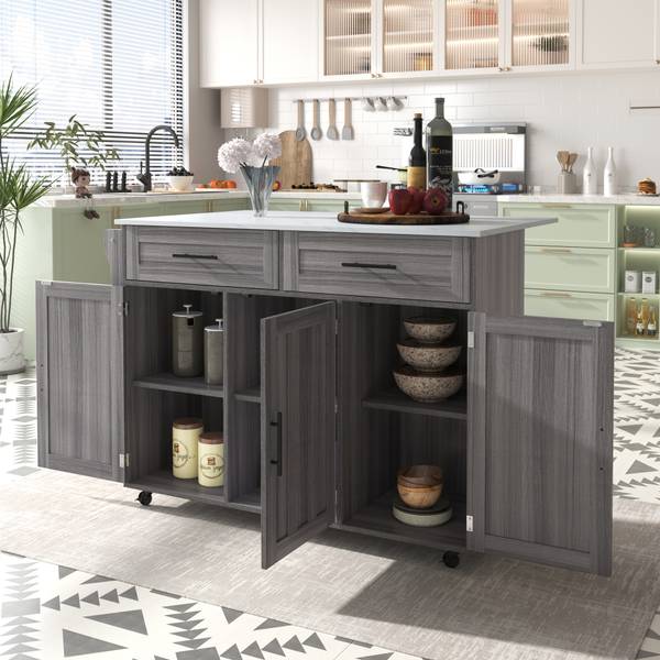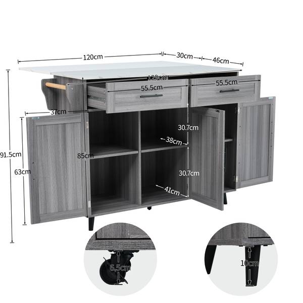 Cet îlot de cuisine est également équipé de quatre pieds en bois massif et d'une plaque de support centrale. Si vous n'avez pas besoin de déplacer cette armoire, vous pouvez remplacer les roues par des pieds d'armoire.
