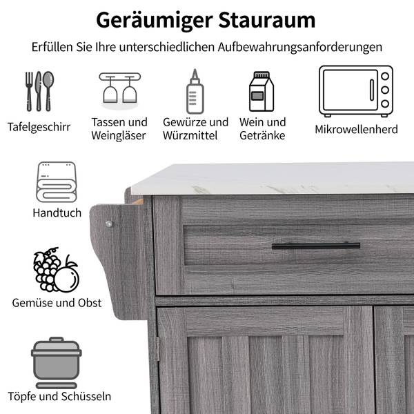 Deux grands tiroirs offrent beaucoup d'espace de rangement, dont un étui à couverts amovible pour une gestion facile des couverts. Derrière les trois portes se trouvent six compartiments de rangement séparés avec des étagères réglables en hauteur sur trois niveaux pour ranger des objets à différentes hauteurs. L'intérieur est doté d'un pôle magnétique solide, doté d'une forte aspiration et facile à installer. Un porte-serviettes en bois massif avec un espacement de φ2,5 cm et 37 cm est inclus, qui peut être utilisé comme poignée de chariot ou pour suspendre des objets.