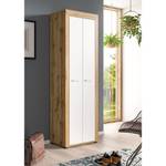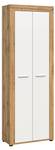 Les deux portes s'ouvrent grâce à d'élégantes poignées couleur métal, et derrière elles se trouve un compartiment pratique pour ranger chaussures, bottes ou accessoires. L'armoire repose sur de petits pieds noirs qui facilitent le nettoyage sous les meubles et apportent une touche de légèreté à la pièce.