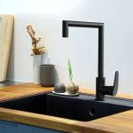Mitigeur cuisine moderne avec son design noir mat et sa forme carré, le mitigeur ""Fangolo"" est facile à installer avec son système ESSEFIX, il est de plus équipé d'un aérateur anticalcaire et économie d'eau.