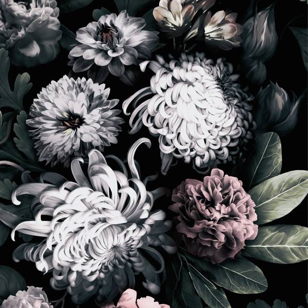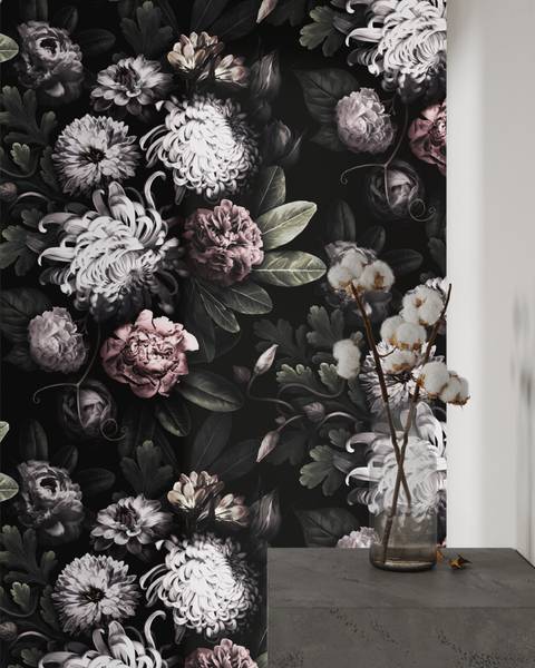 Le flamboiement des fleurs dans des tons chauds, le contraste vif entre le fond noir et les fleurs blanches, la lumière douce... ce sont les éléments qui rendent ce papier magnifique. Régale, romantique, avec de la personnalité! Placez-le dans le salon ou la chambre à coucher pour une atmosphère luxueuse.