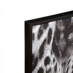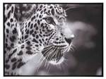 La toile imprimée "Animaux" représente le portrait d'un fauve en noir et blanc. Le motif du pelage de l'animal et l'expression de ses traits sont ainsi mis en valeur par la sobriété des coloris et de l'encadrement.