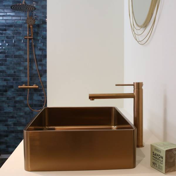 Osez la vasque lavabo inox avec la collection Luisa ici en couleur cuivre brossé. Doté d'un traitement PVD pour une finition encore plus résistante ! La vasque moderne à poser.